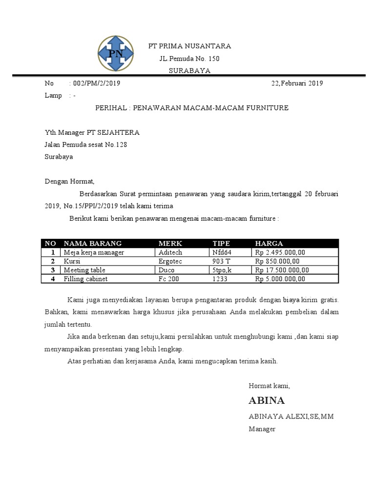 Membuat surat penawaran barang/ jasa bukan hanya tentang tulisan berisi penawaran belaka, tapi ada tata caranya karena jenis surat ini adalah surat resmi yang punya aturan. Contoh surat forniture pt prima nusantara bahasa inggris / kop surat. Contoh surat forniture pt prima nusantara bahasa inggris : Pt energi prima nusantara jalan minangkabau 28b jakarta selatan dengan hormat, berdasarkan surat penawaran nomor : Check spelling or type a new query.